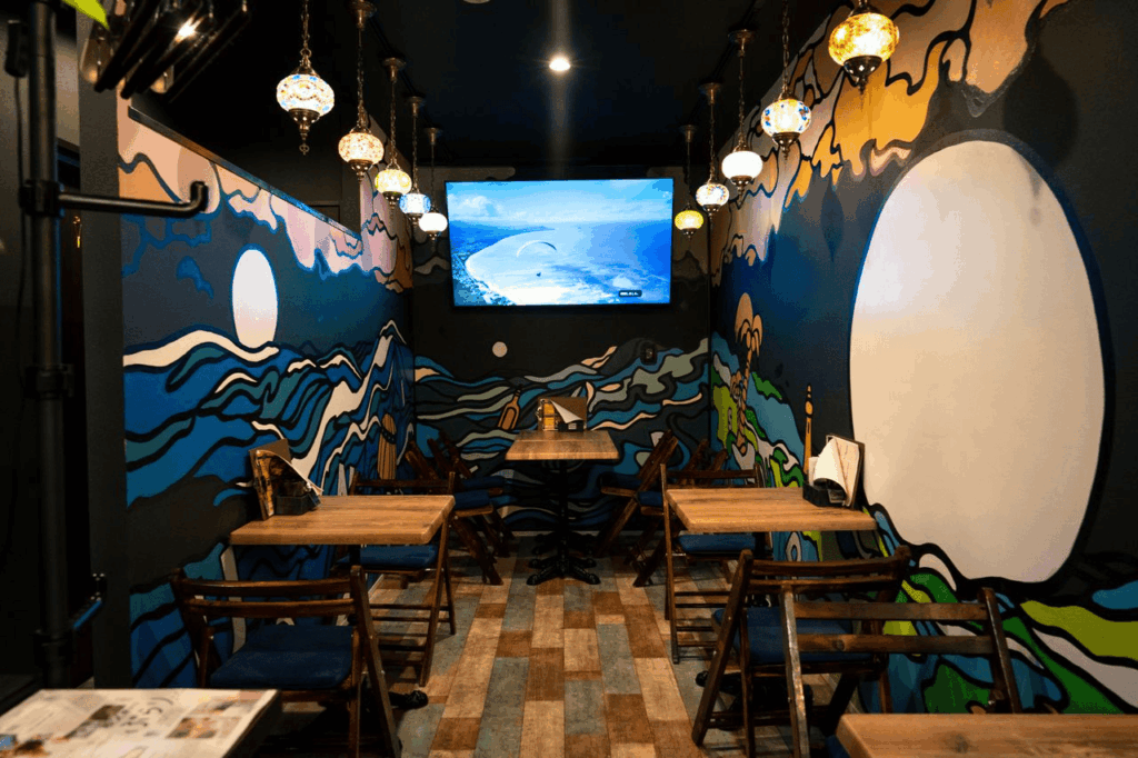 海の壁画とトルコランプが作り出す、異国の様な空間