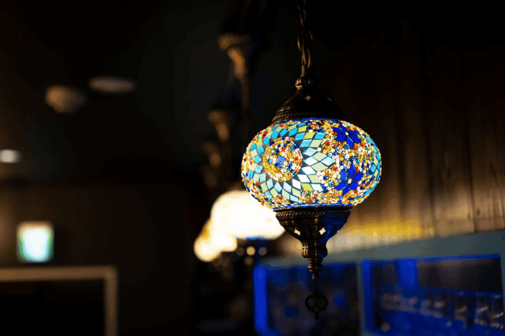 ランプはそれぞれ色や模様が異なり、やわらかな光が店内にゆるやかな心地よさを添えています。