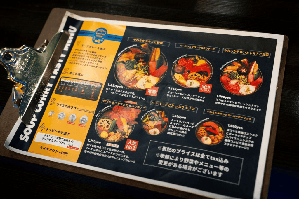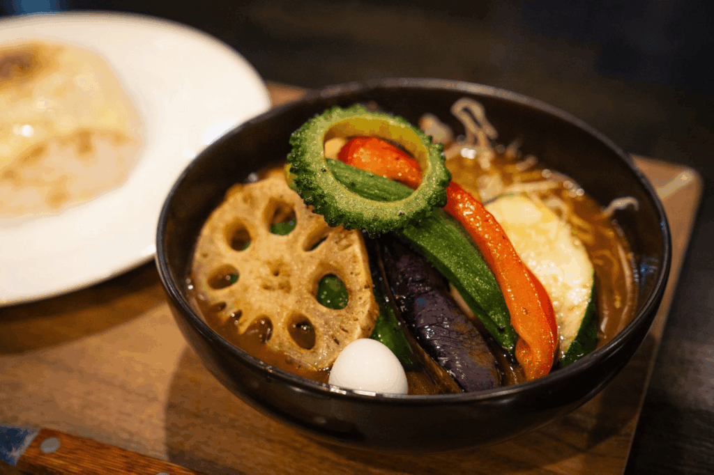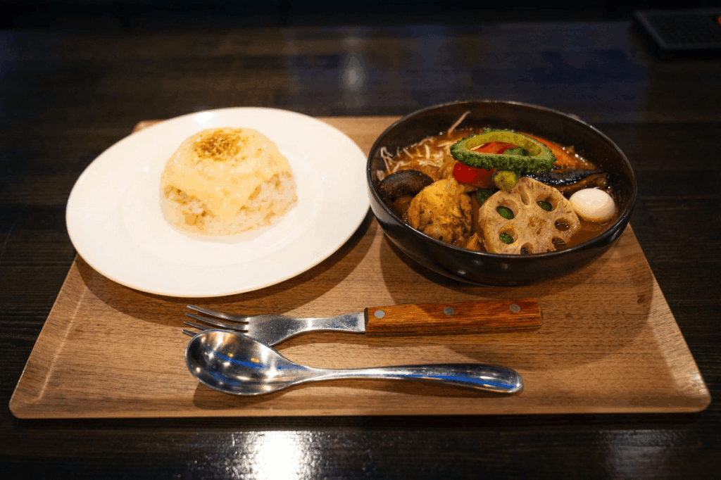 お店の看板メニューは、こだわりのスープカレー。スープカレーのルーツは諸説ありますが、「薬膳スープに野菜をごろごろと加えたものが始まり」とのいわれがあります。