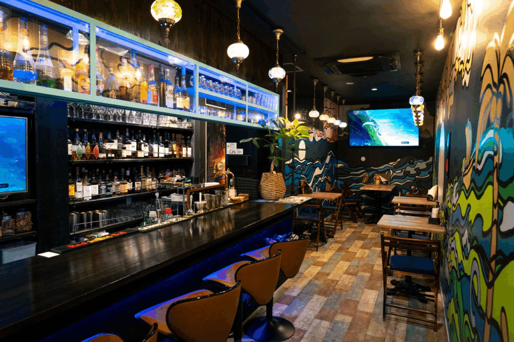 店内に入ってまず目を引くのは、大胆に描かれた海の壁画。さまざまな青や緑をベースに、波や船、ヤシの木などのモチーフで構成され、全体的に落ち着いた雰囲気を感じます。