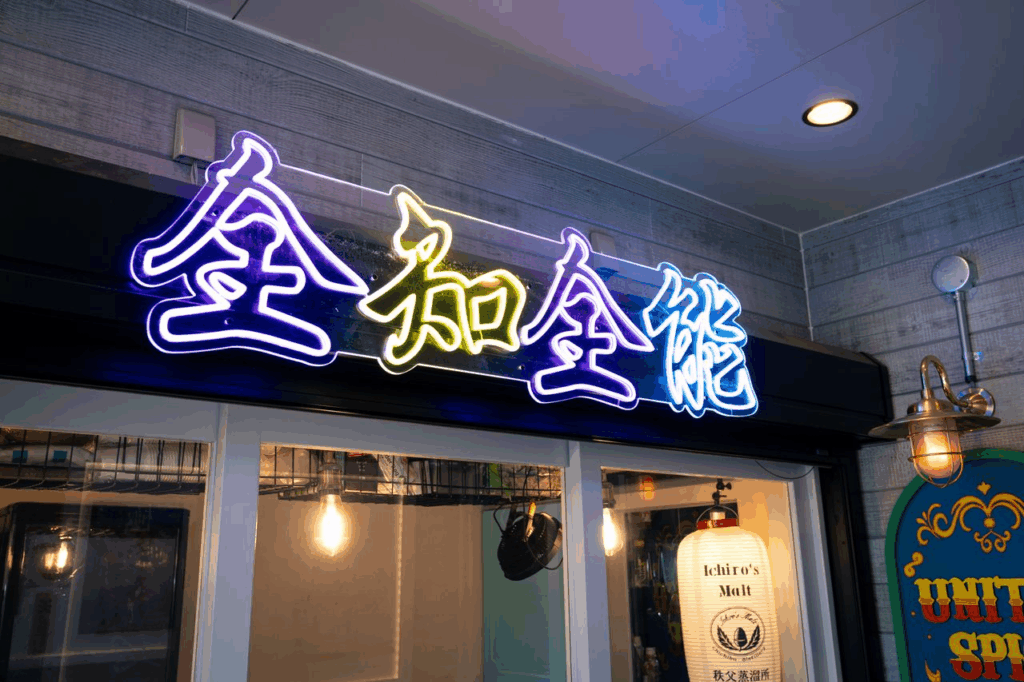 入り口近くに掲げられた「全知全能」という漢字のサイン。外国人観光客にも目を引くように、インパクトのある四文字を掲げたのだそうです。「なんだろう?」と立ち止まってもらうための、ちょっとした仕掛けだそうです。