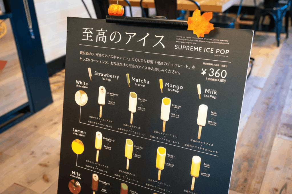 アイスバー(ミルク・抹茶・ストロベリー・マンゴー)とチョコレートソース(ミルク・ホワイト・季節限定で冬春=ストロベリー、夏秋=レモン)を自由に組み合わせられるので、選ぶ楽しさも。「この組み合わせが好き」「こっちが映えるかも」と、考えながら選ぶのも楽しいです。