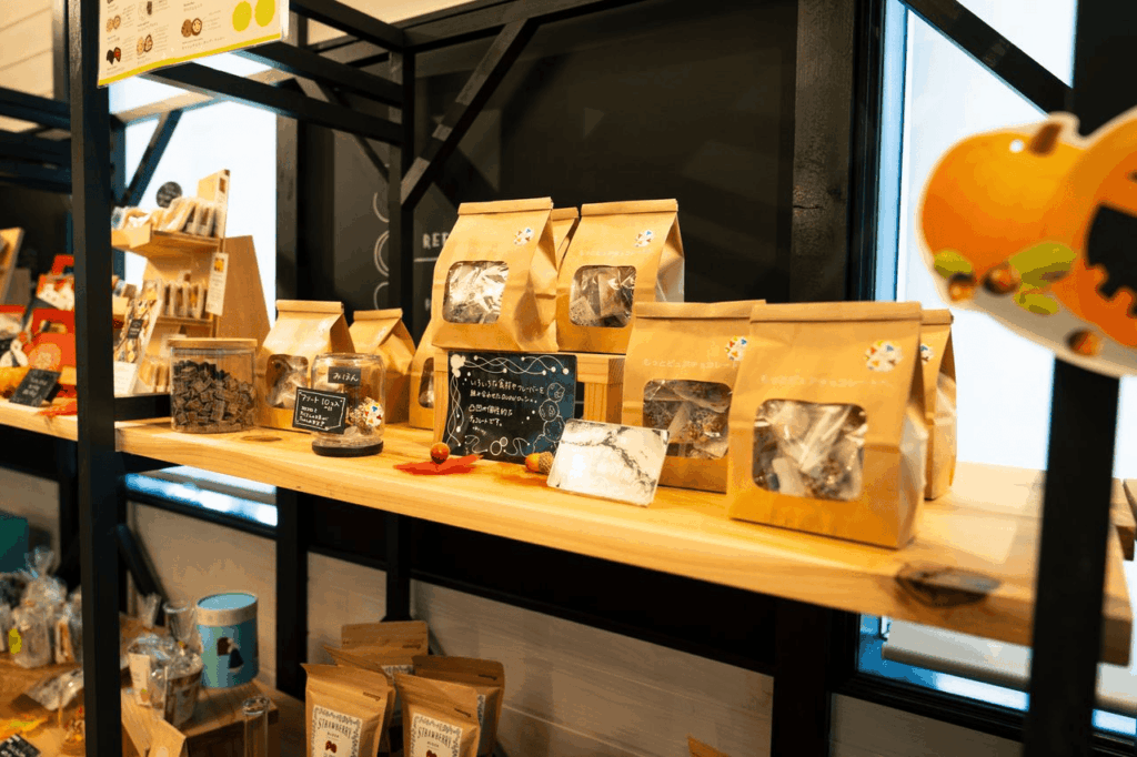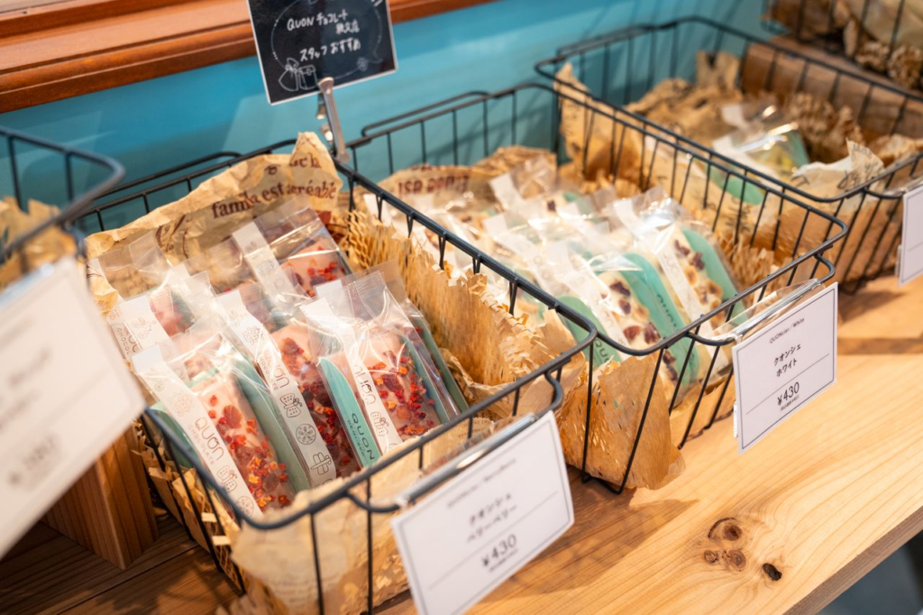 店内の中ほどにはキッチンスペースがあります。窓越しにスタッフがナッツやドライフルーツを刻んだり、チョコレートをコーティングする様子が見られることも。丁寧なお菓子作りが直近に感じられるのも、このお店ならではの楽しみです。