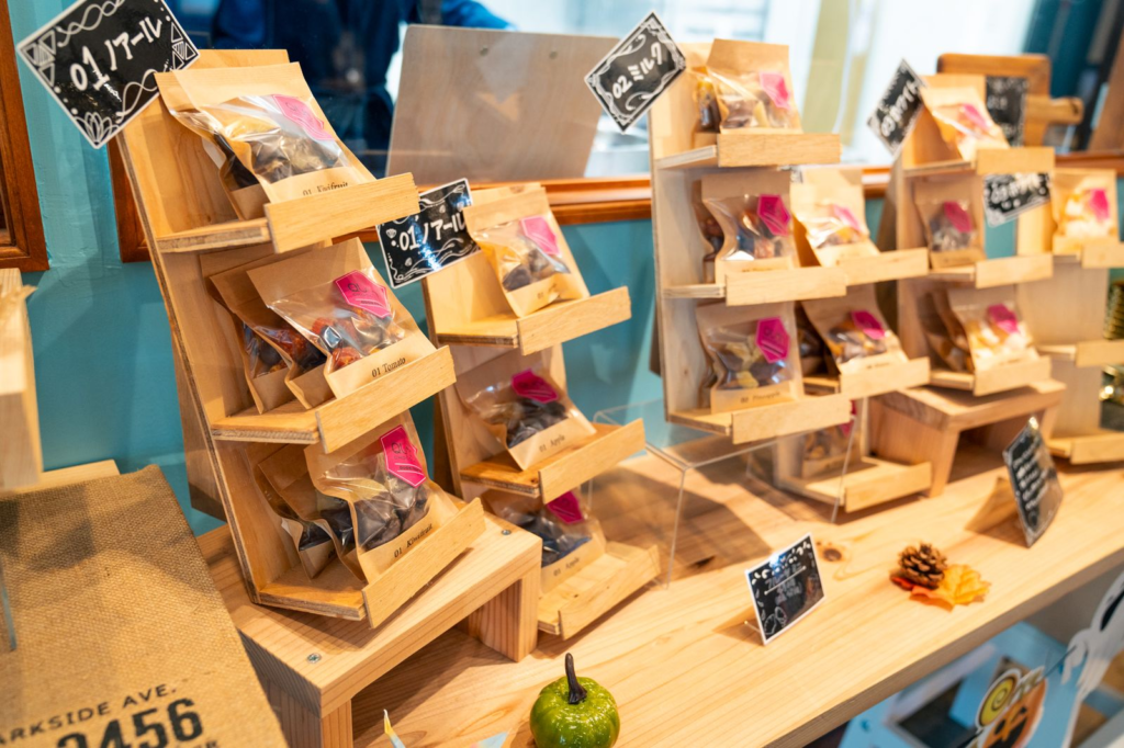 なかには「コーン入り」といったユニークなフレーバーもあり、久遠チョコレート全体ではおよそ170種類が展開されています。秩父店では、その中から30種類ほどを常時取りそろえています。