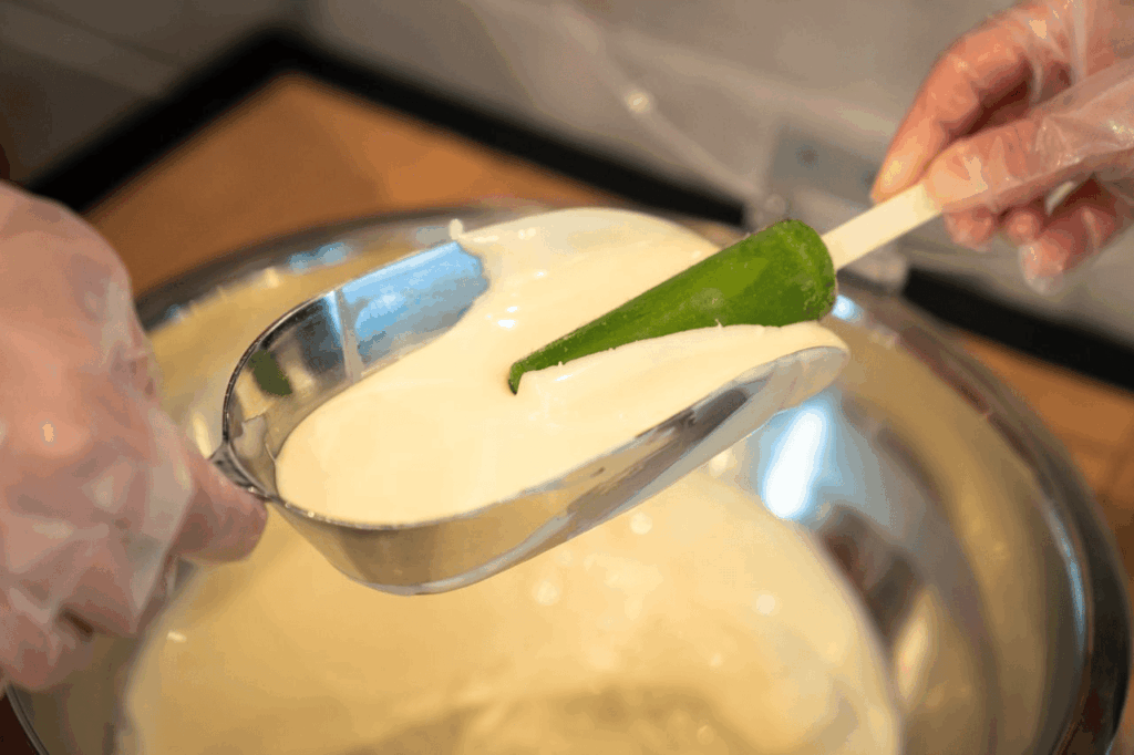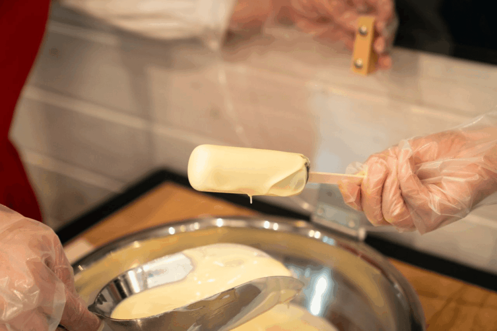 大きなスコップのような受け皿ですくってくれるチョコソースの中で、アイスバーをくるりと一回転。ツヤツヤのチョコソースの表面が、徐々に冷えてマットな風合いになったら、食べ頃のサインです。